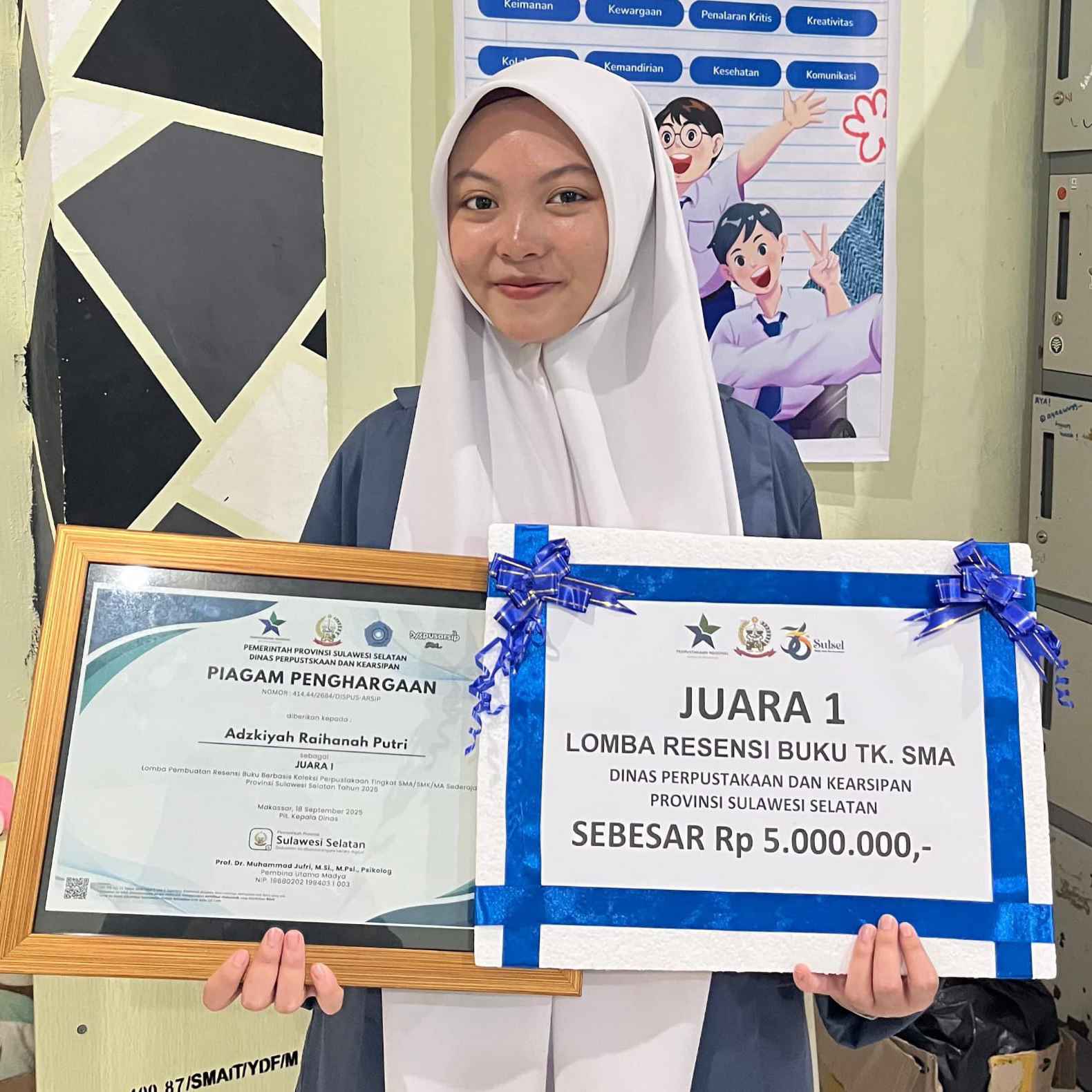 MAKASSAR,SULSEL – Kabar membanggakan datang dari SMAIT Darul Fikri Makassar. Ananda Adzkiyah Raihanah Putri, siswi kelas XI, berhasil meraih Juara 1 Lomba Resensi Buku Tingkat SMA yang diselenggarakan oleh Dinas Perpustakaan dan Kearsipan Provinsi Sulawesi Selatan.