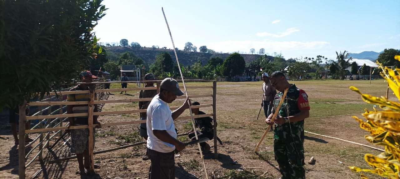 XposeTV NTB – Sumbawa – Utan, Serda Muhammad Babinsa Balebrang melaksanakan kegiatan gotong royong pembuatan pagar lapangan sepak bola bersama warga Binaanya yang bertempat di lapangan sepakbola desa Balebrang Kecamatan Utan Kabupaten Sumbawa, Jum’at (10/05/2024).