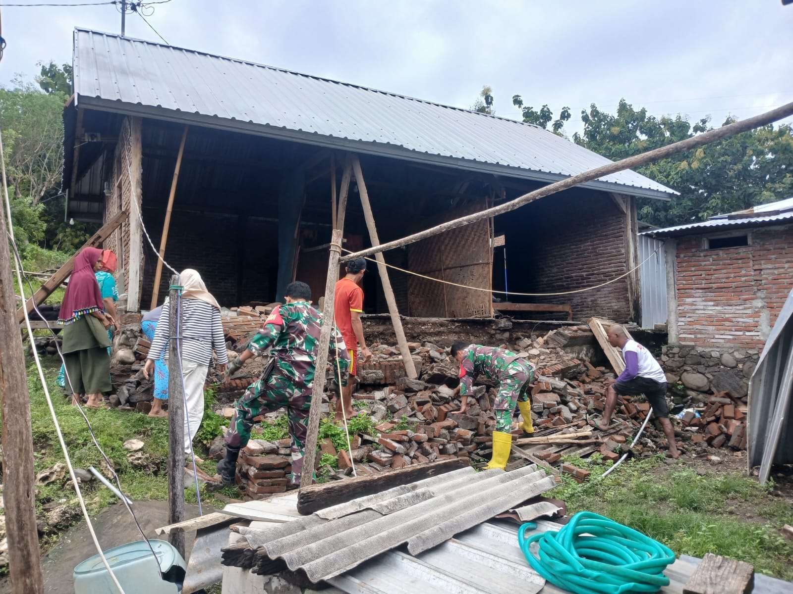 Mengetahui kejadian tersebut, Babinsa Serda Akhyar segera mendatangi lokasi kejadian untuk melakukan pengecekan kondisi rumah sekaligus memberikan bantuan awal. Bersama personel Koramil 1607-09/Utan dan warga sekitar, Babinsa bahu-membahu mengumpulkan material tembok yang roboh serta membersihkan sisa-sisa runtuhan agar tidak mengganggu akses jalan dan aktivitas masyarakat.