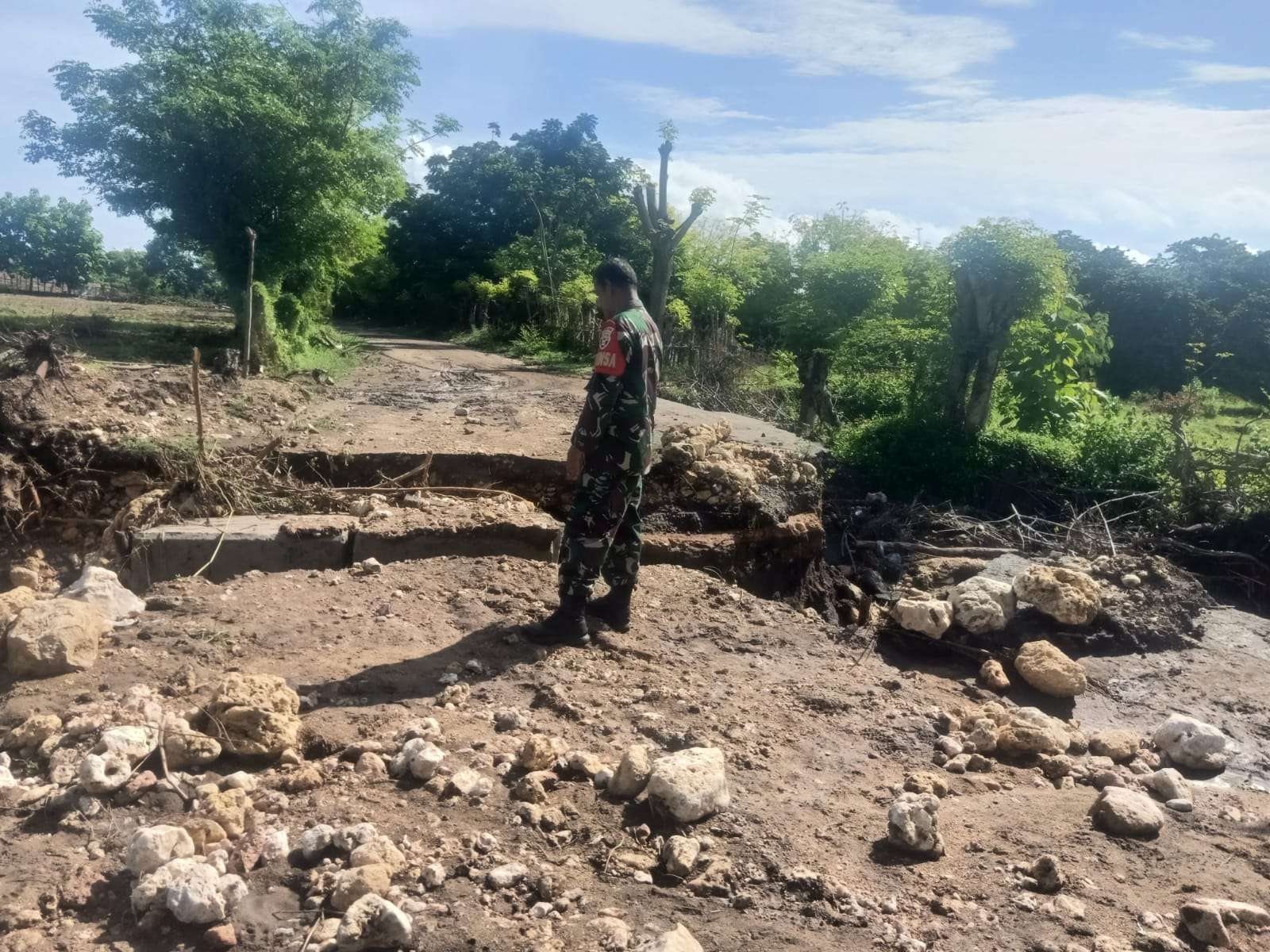 Sumbawa, NTB — Babinsa Desa Batu Bangka, Sertu Hamden, bersama perangkat desa melaksanakan pengecekan langsung terhadap kerusakan jalan lintas Batu Bangka–Prajat di Kecamatan Moyo Hilir, Kabupaten Sumbawa. Kamis (04/12/2025).