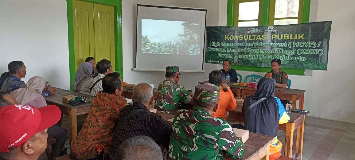 Lamongan, Xposetv.live – Bintara Urusan Dalam (Batuud) Pelda Suratman dan Bintara Pembina Desa (Babinsa) Koramil 0812/06 Ngimbang menghadiri konsultasi publik Kawasan Bernilai Konservasi Tinggi di yang diselenggarakan oleh Perhutani yang berlokasi di Kantor Perhutani Kecamatan Ngimbang.
