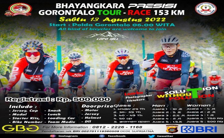 Untuk diketahui, Event Bhayangkara Tour and Race 2022 merupakan rangkaian peringatan Hari Bhayangkara ke 76 sekaligus menyambut Hari Ulang Tahun Kemerdekaan Republik Indonesia ke-77 yang jatuh pada tanggal 17 Agustus mendatang, Polda Gorontalo bekerja sama dengan Bank Rakyat Indonesia (BRI) dan Gorontalo Bhayangkara Gowes (GBG) menggelar Event Bhayangkara Tour And Race 2022. Lomba ini dibagi menjadi 5 kategori, antara lain : Under 29, Usia 30 s/d 40, Usia 40 s/d 50, Usia diatas 50, serta kategori Wanita guna memperebutkan juara 1 sebesar 10 juta Rupiah, dan akan dilaksanakan 13 Agustus 2022 dengan jarak tempuh 153 Km.