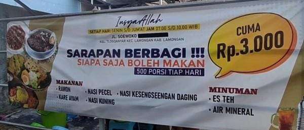 Warung di Lamongan ini tak memiliki nama. Hanya ada spanduk yang isinya ‘Sarapan Berbagi!!!’. Berbeda dengan warung makan pada umumnya, warung yang berlokasi di Kelurahan Tlogoanyar, Kecamatan Lamongan, tepatnya di Jalan Soewoko Lamongan ini menjual beragam menu masakan hanya dengan harga Rp 3 ribu per porsi.