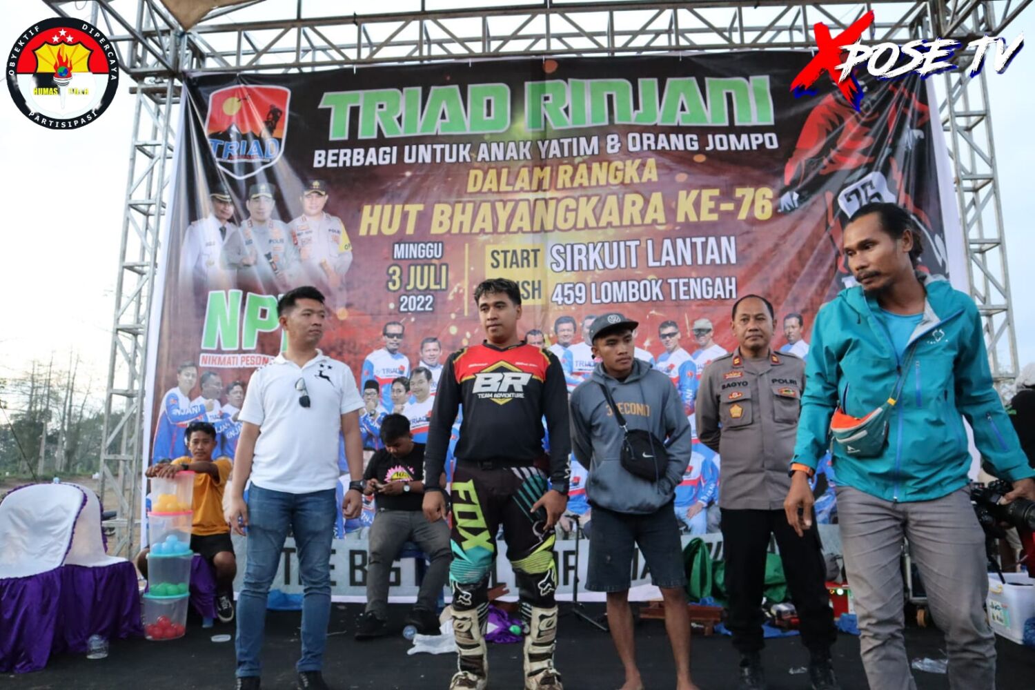Pada pukul 15.00 Wita, seluruh peserta tiba di garis finish dan dilanjutkan dengan penyerahan santunan kepada anak yatim dan orang tua jompo oleh Kapolres lombok Tengah yang diserahkan kepada Kades Lantan, Bhabinkamtibmas Desa Lantan dan Babinsa Desa Lantan serta pada pukul 16.30 wita acara dilanjutkan hiburan musik serta pembagian dorprize oleh panitia penyelanggara. (Dalam Rangka Hari Bhayangkara ke-76, Polres Loteng, Pemda dan TRIAD Adakan Trabas