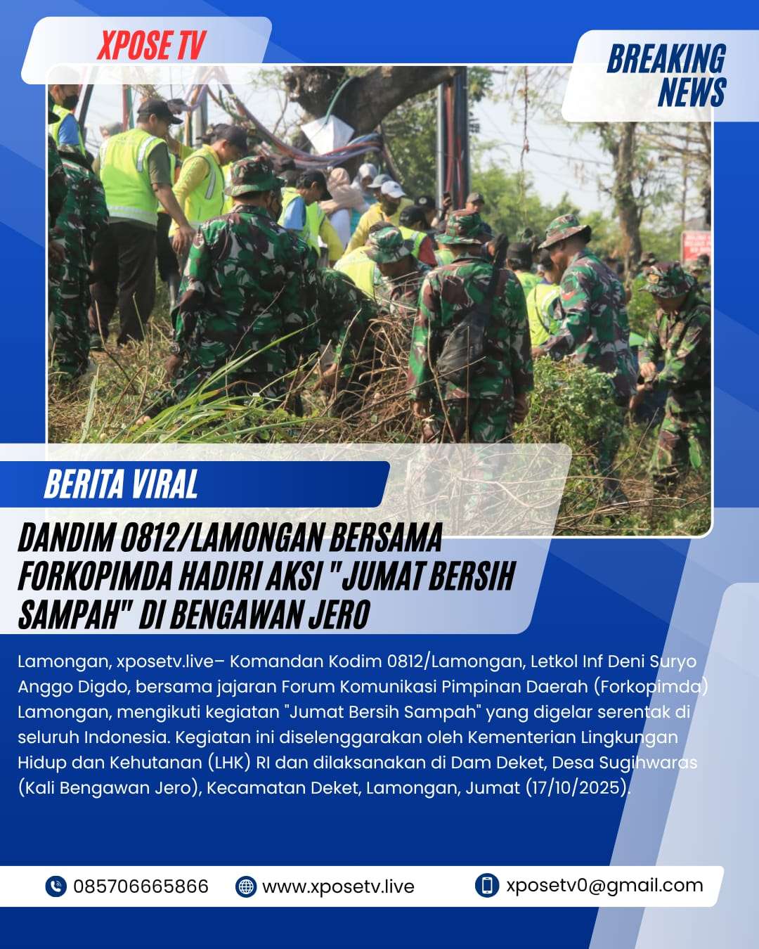 Lamongan, Xposetv.live – Komandan Kodim 0812/Lamongan, Letkol Inf Deni Suryo Anggo Digdo, bersama jajaran Forum Komunikasi Pimpinan Daerah (Forkopimda) Lamongan, mengikuti kegiatan “Jumat Bersih Sampah” yang digelar serentak di seluruh Indonesia. Kegiatan ini diselenggarakan oleh Kementerian Lingkungan Hidup dan Kehutanan (LHK) RI dan dilaksanakan di Dam Deket, Desa Sugihwaras (Kali Bengawan Jero), Kecamatan Deket, Lamongan, Jumat (17/10/2025).