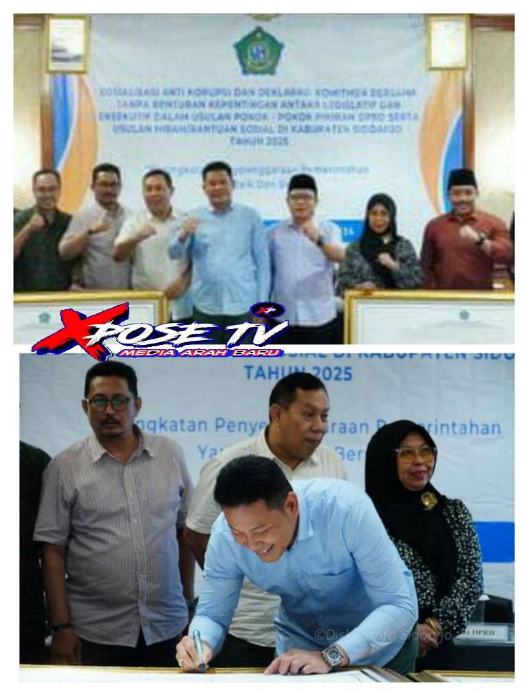 Xpose tv. Live, Sidoarjo – Deklarasi anti korupsi gelaran Pemkab Sidoarjo dalam kegiatan sosialisasi anti korupsi dan deklarasi komitmen bersama tanpa benturan kepentingan antara legislatif dan eksekutif dalam usulan pokok-pokok pikiran DPRD serta usulan hibah / bantuan sosial di Kabupaten Sidoarjo tahun 2025, di Hotel Shangrila, Surabaya. Kamis (6/6/24)