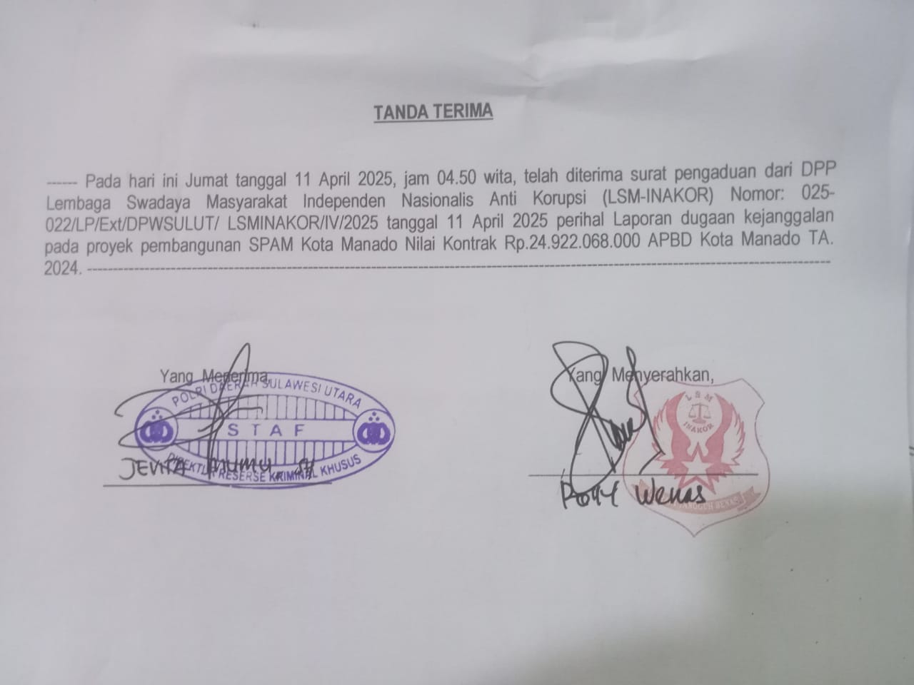 Sulut – XposeTV. Diduga rawan penyimpangan. Lembaga Swadaya Masyarakat (LSM) Independen Nasionalis Anti Korupsi (INAKOR) Sulawesi Utara melaporkan proyek strategis Pembangunan Sistem Penyediaan Air Minum (SPAM) senilai Rp24,9 miliar ke Polda Sulawesi Utara pada Jumat (12/4/2024). Proyek yang didanai APBD Kota Manado Tahun 2024 ini diduga rawan penyimpangan dan berpotensi merugikan keuangan negara.