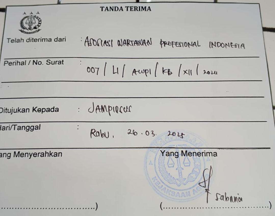 Jerry menjelaskan, surat laporan bernomor 007/LI/AWPI-KB/XII/2024 telah diterima oleh Sabrina, petugas Pelayanan Terpadu Satu Pintu Kejaksaan Agung.