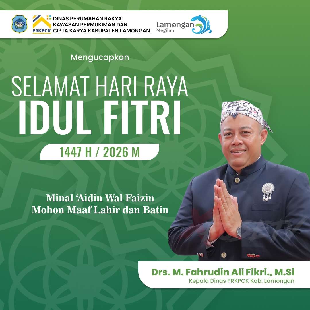 Drs. M Fahrudin Ali Fikri Msi Kepala Dinas PRKPCK Kabupaten Lamongan Mengucapkan Selamat Merayakan Hari Raya Idhul Fitri 2026, Semoga kebahagiaan, kedamaian, dan keberkahan menyertai kita semua. Mari kita rayakan kemenangan atas perjuangan kita melawan hawa nafsu dan marilah kita mempererat tali silaturahmi dengan sesama.
