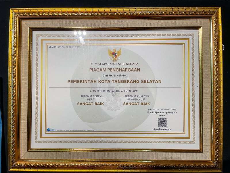 Penghargaan diberikan oleh Ketua Komisi Aparatur Sipil Negara (KASN) Prof. Agus Pramusinto dan diterima langsung oleh Wali Kota Tangerang Selatan Benyamin Davnie di Kraton Grand Ballroom Yogyakarta Marriot Hotel, pada Kamis (07/12/2023).