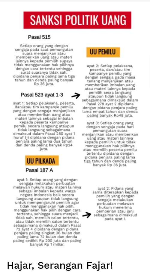 “Serangan Fajar” merupakan istilah populer dari politik uang. Berdasarkan Pasal 515 dan Pasal 523 ayat 1-3 Undang-Undang Nomor 7 Tahun 2017 tentang Pemilu dan Pasal 187 A ayat 1 dan 2 UU Nomor 10 Tahun 2016 tentang Pilkada bahwa bentuk serangan fajar tidak terbatas pada uang.
