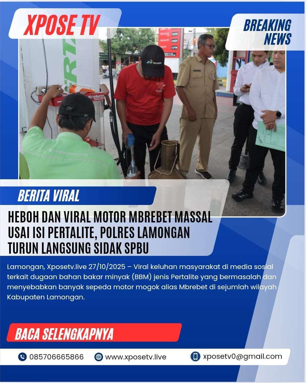 Lamongan, Xposetv.live 27/10/2025 – Viral keluhan masyarakat di media sosial terkait dugaan bahan bakar minyak (BBM) jenis Pertalite yang bermasalah dan menyebabkan banyak sepeda motor mogok alias Mbrebet di sejumlah wilayah Kabupaten Lamongan.