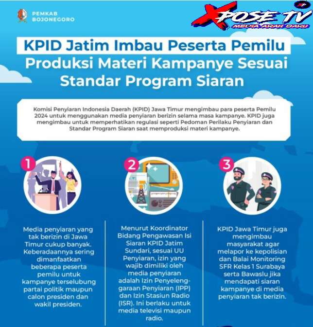 Xpose tv. Live, Bojonegoro – Himbauan Komisi Penyiaran Indonesia Daerah (KPID) Jawa Timur pada peserta Pemilu 2024 untuk menggunakan media penyiaran berizin selama masa kampanye. KPID juga mengimbau untuk memperhatikan regulasi seperti Pedoman Perilaku Penyiaran dan Standar Program Siaran saat memproduksi materi kampanye.
