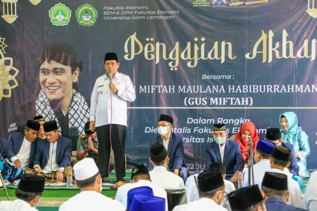 “Atas usia ke-22 Fakultas Ekonomi Unisla. Salahsatu perguruan tinggi terkemuka di Kabupaten Lamongan yang selama ini turut ikut membangun pendidikan dan karakter pemuda Lamongan,” ucap Kyai Rouf.