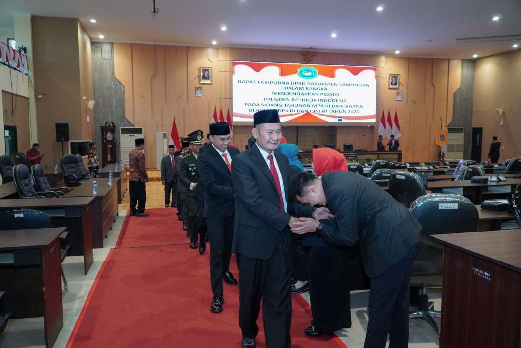 Lamongan,Xposetv.live – Bupati Lamongan Yuhronur Efendi beserta jajaran Forkopimda Kabupaten Lamongan ikuti pidato kenegaraan oleh Presiden Republik Indonesia Prabowo Subianto, pada sidang tahunan MPR RI dan sidang bersama DPR RI tahun 2025 secara virtual, Jumat (15/8) di Ruang Rapat Paripurna di Gedung DPRD Kabupaten Lamongan.