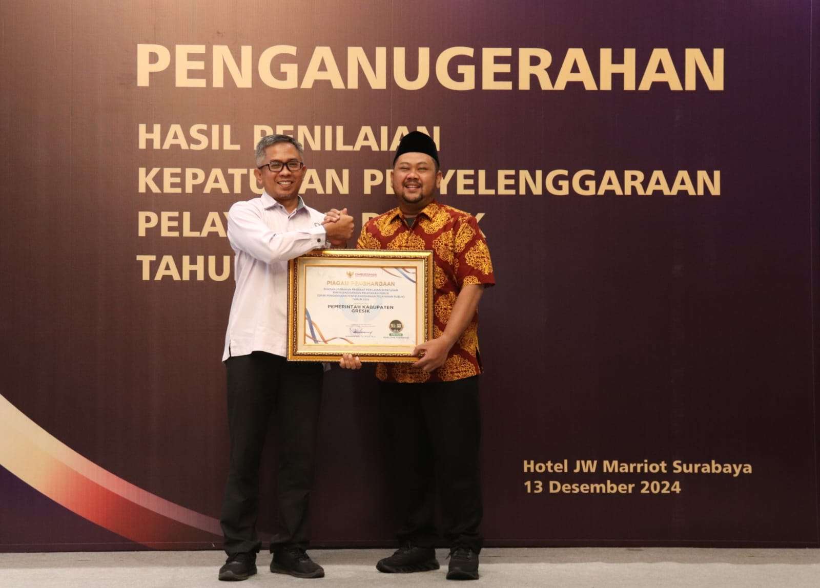 Penghargaan tersebut diberikan oleh Ombudsman Republik Indonesia (ORI) Jawa Timur dalam acara Penganugerahan Hasil Penilaian Kepatuhan Penyelenggaraan Pelayanan Publik 2024 yang berlangsung di JW Marriot Hotel, Surabaya, Jumat (13/12).