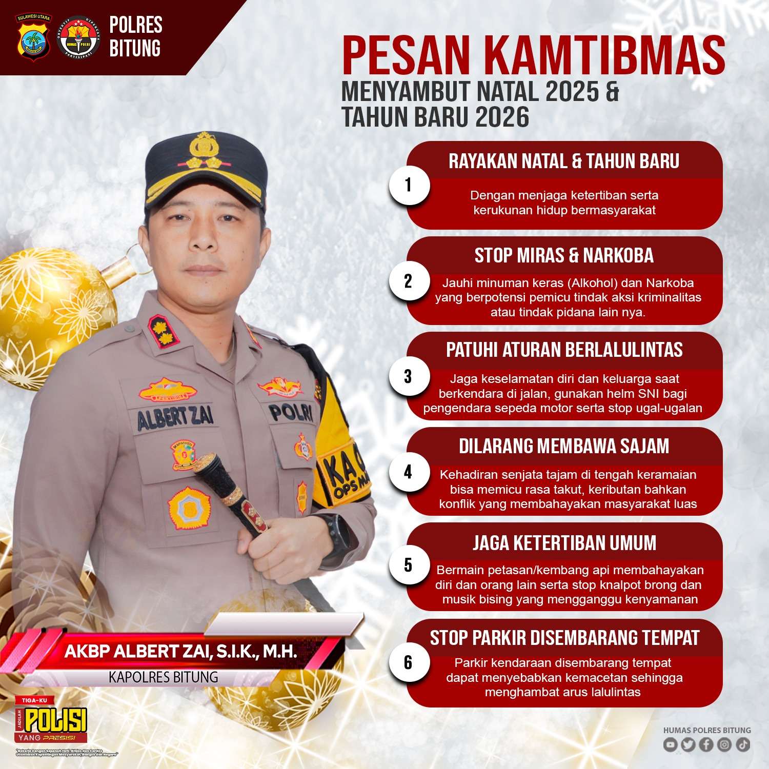 Bitung, XposeTV– Menyambut perayaan Natal 2025 dan Tahun Baru 2026, Kapolres Bitung AKBP ALBERT ZAI., SIK.,MH, menyampaikan pesan keamanan dan ketertiban masyarakat (Kamtibmas) kepada seluruh warga Kota Bitung agar momentum hari besar keagamaan dan pergantian tahun dapat dirayakan dengan aman, damai, dan penuh sukacita.