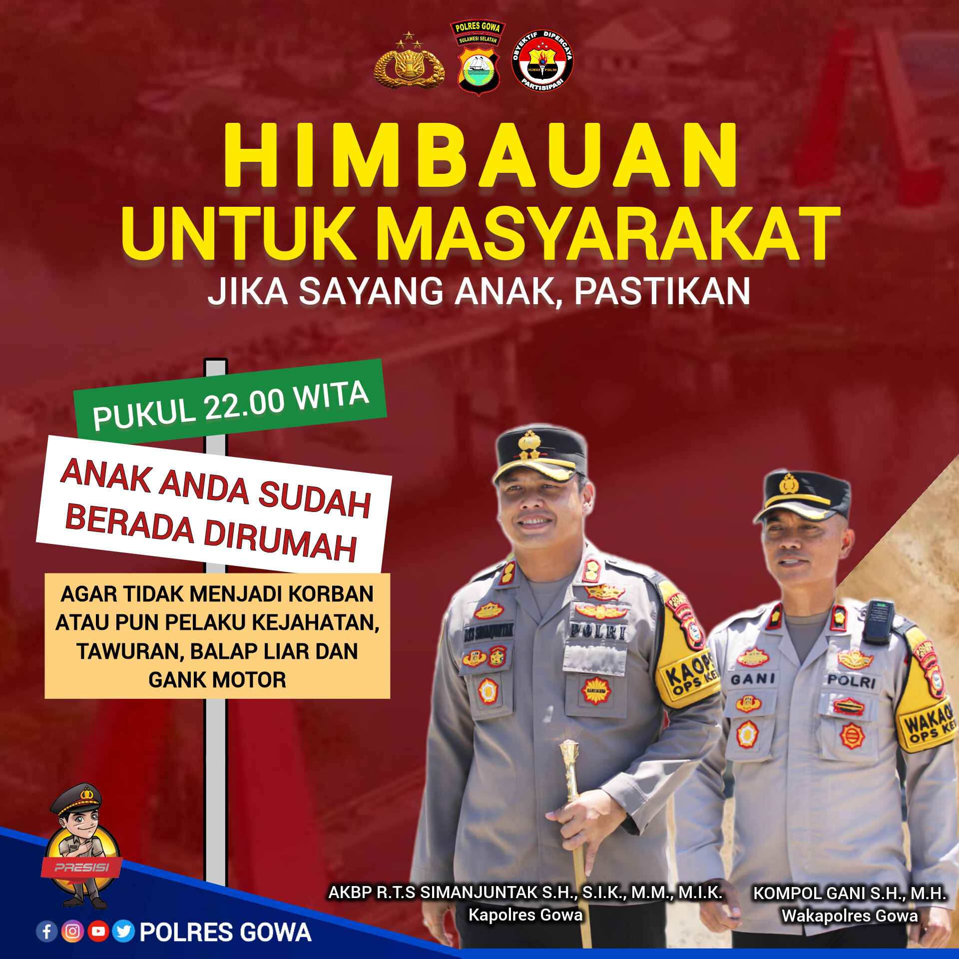 GOWA – Dalam upaya menjaga ketertiban dan keamanan di wilayah Gowa, Kapolres Gowa, AKBP R.T.S Simanjuntak, mengeluarkan imbauan kepada masyarakat, khususnya para orang tua, untuk lebih memperhatikan aktivitas anak-anak mereka di malam hari, Sabtu (08/3/2025).