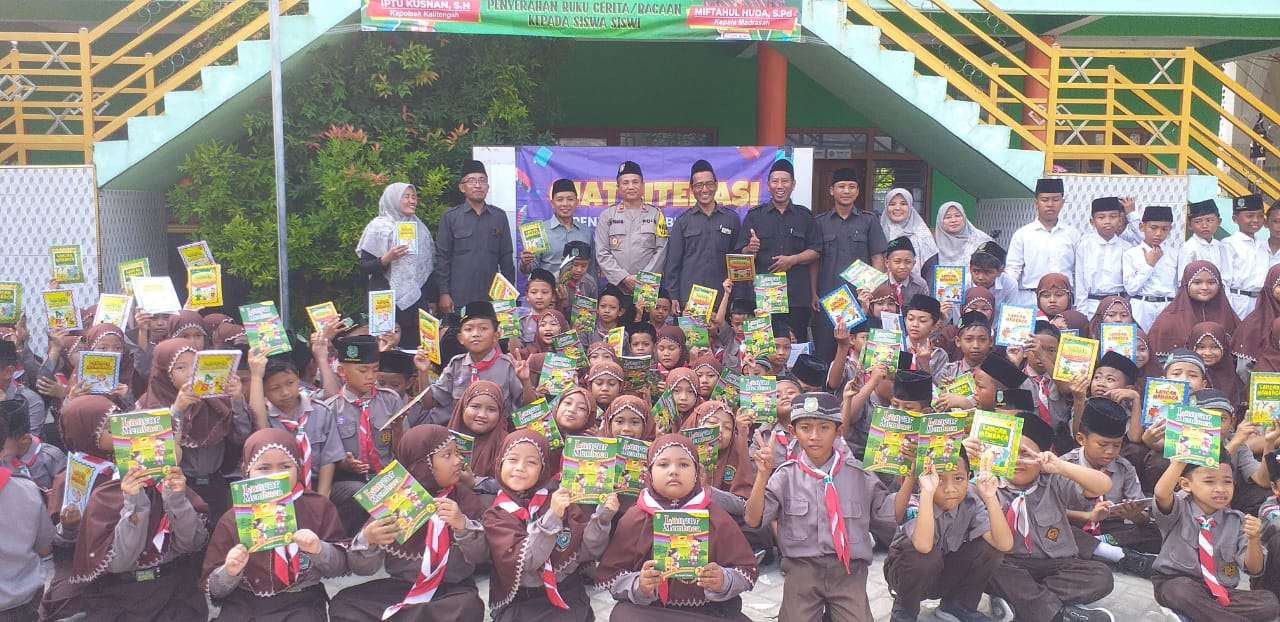 Di tempat ini, Kapolsek kembali menyerahkan 100 buku bacaan kepada pihak sekolah yang juga dihadiri oleh pengawas MI, kepala sekolah, dan guru-guru setempat.