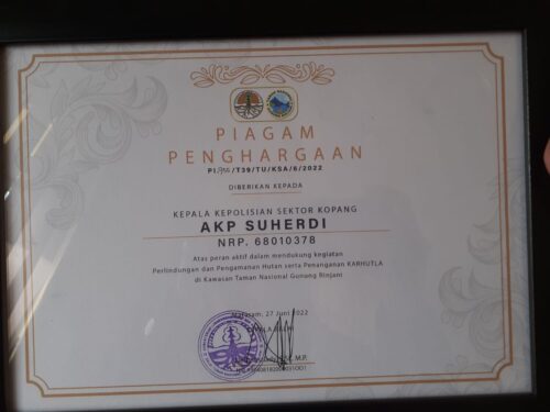 Piagam penghargaan diberikan atas peran aktif Kapolsek Kopang AKP Suherdi dalam mendukung kegiatan perlindungan dan pengamanan hutan serta penanganan Karhutla (Kebakaran Hutan dan Lahan) di Kawasan Taman Nasional Gunung Rinjani (TNGR).