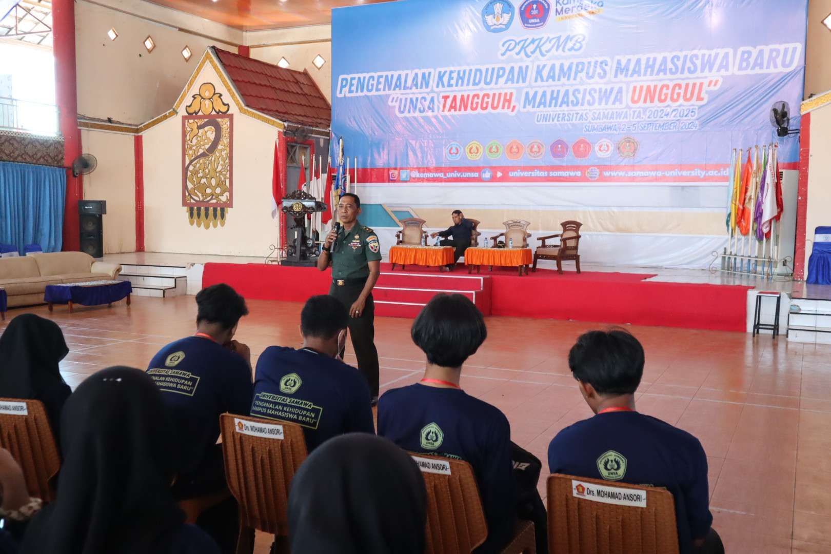 XposeTV NTB – Sumbawa Besar, Dalam rangka memperkenalkan kehidupan kampus serta menanamkan nilai-nilai kebangsaan kepada generasi muda, Kasdim 1607/Sumbawa, Mayor Inf Dahlan S.Sos., memberikan materi wawasan kebangsaan kepada para mahasiswa dan mahasiswi baru Universitas Samawa. Kegiatan ini berlangsung di Auditorium Universitas Samawa pada Rabu (04/09/2024).