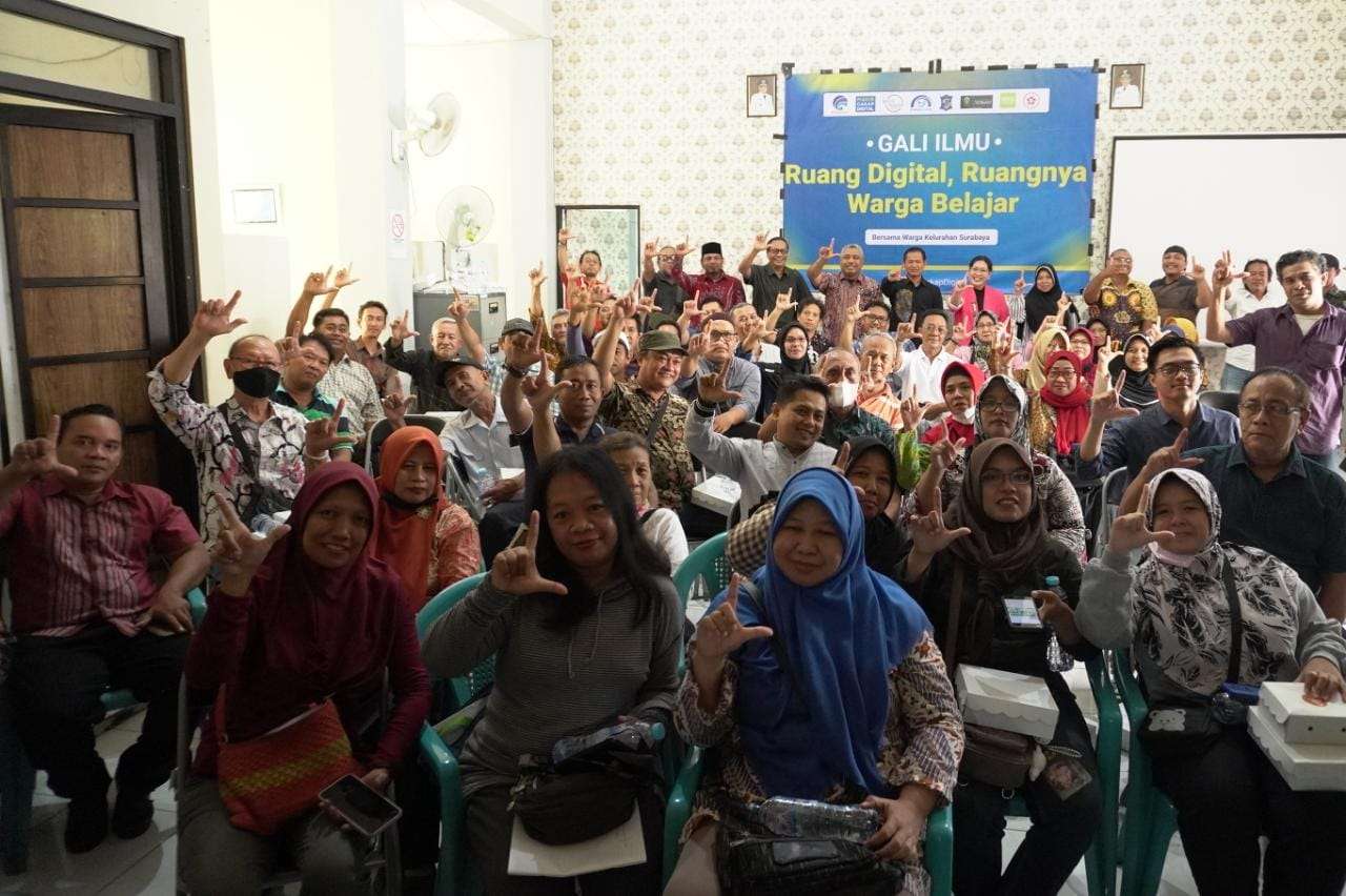 XPOSE TV SURABAYA – Warga Kelurahan Simomulyo Baru Surabaya saat sesi foto bersama usai mengikuti kegiatan seminar sesi satu literasi digital bertajuk ‘Gali Ilmu : Ruang Digital, Ruangnya Warga Belajar, di Aula Kelurahan Simomulyo. Kemkominfo Tingkatkan Literasi Digital di Surabaya