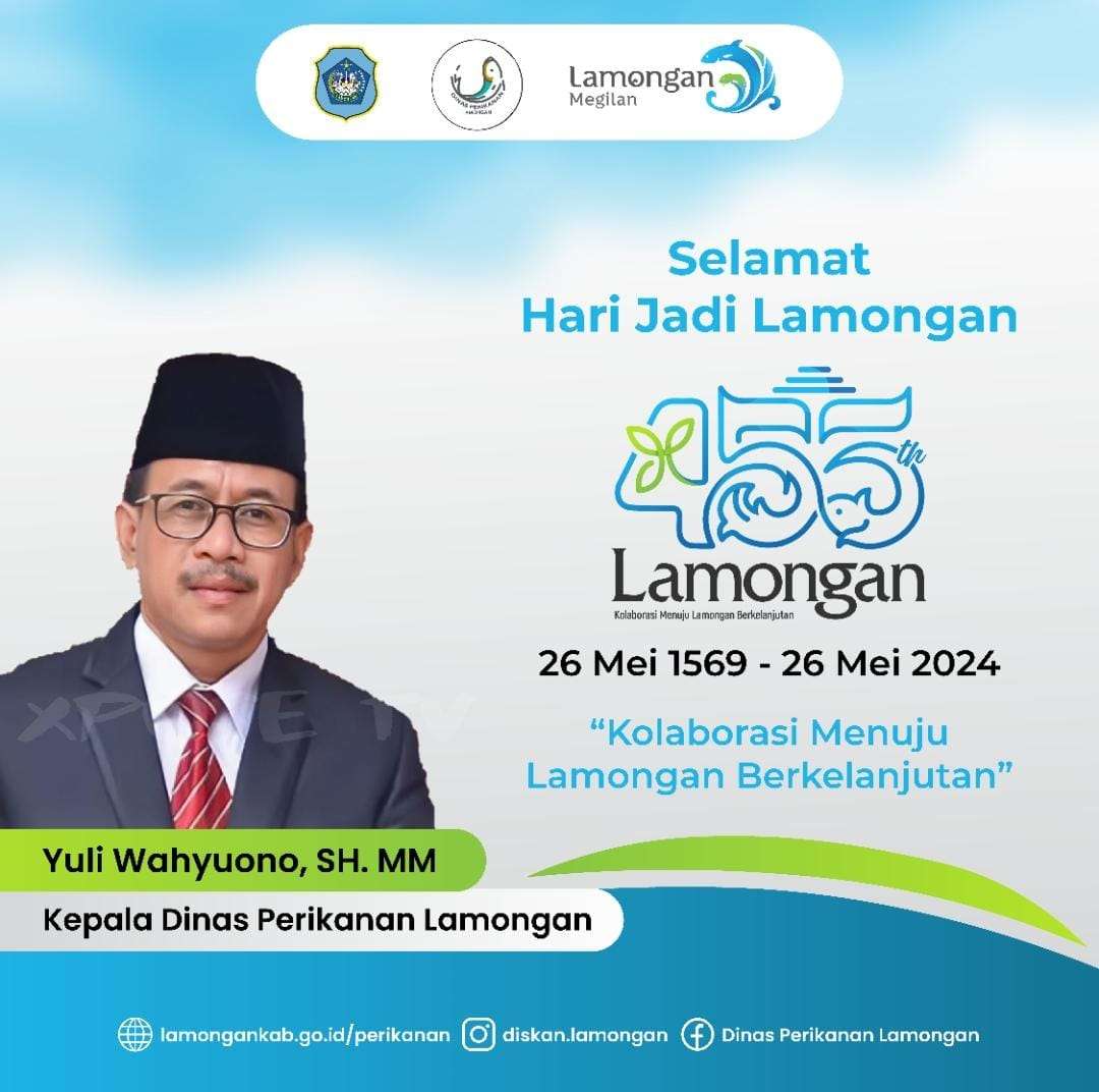 Kepala Dinas Perikanan Kabupaten Lamongan Yuli Wahyuono SH, MM Beserta jajaran staf mengucapkan Selamat Hari Jadi Lamongan ke 455 tahun semoga Lamongan terus berinovasi dan maju di segala bidang menuju KEJAYAAN LAMONGAN
