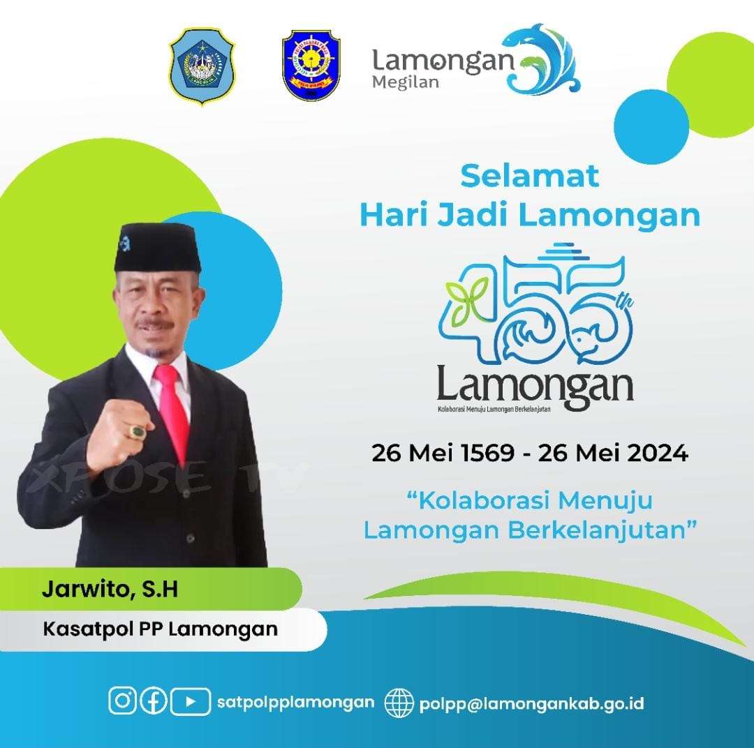 Kepala Satpol PP Kabupaten Lamongan Jarwito SH Beserta jajaran staf mengucapkan Selamat Hari Jadi Lamongan ke 455 tahun semoga Lamongan terus berinovasi dan maju di segala bidang menuju KEJAYAAN LAMONGAN yang berkeadilan.