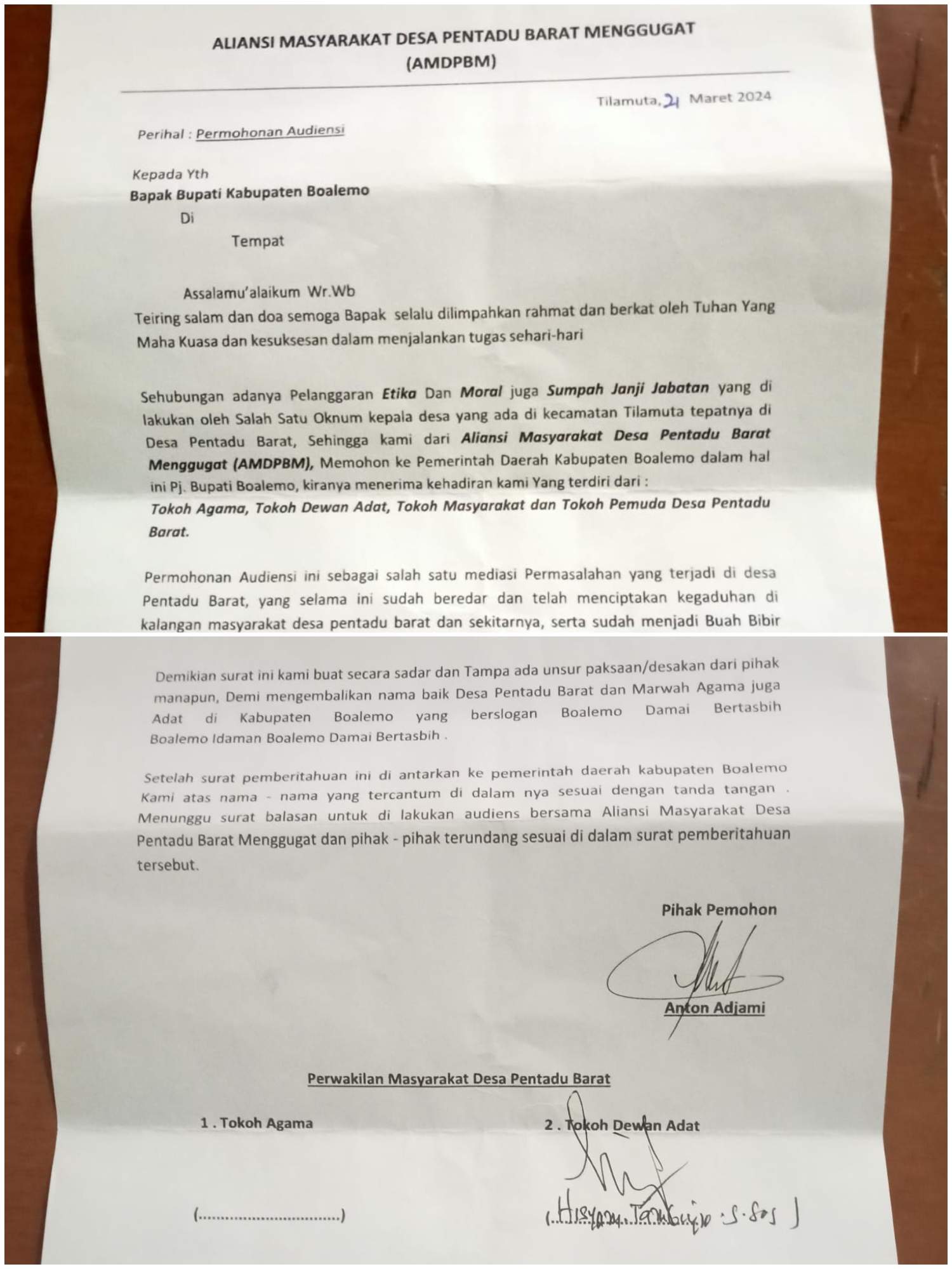 Perihal perbuatan seorang Kepala Desa aktif di Kecamatan Tilamuta Kabupaten Boalemo, Melalui surat tersebut yang di bubuhi tanda tangan dari perwakilan masyarakat dan Perwakilan dewan adat daerah Boalemo. Meminta kepada Pj Bupati Boalemo agar bisa menyelesaikan persoalan yang terjadi di Pemerintah Desa Pentadu BaratBarat.