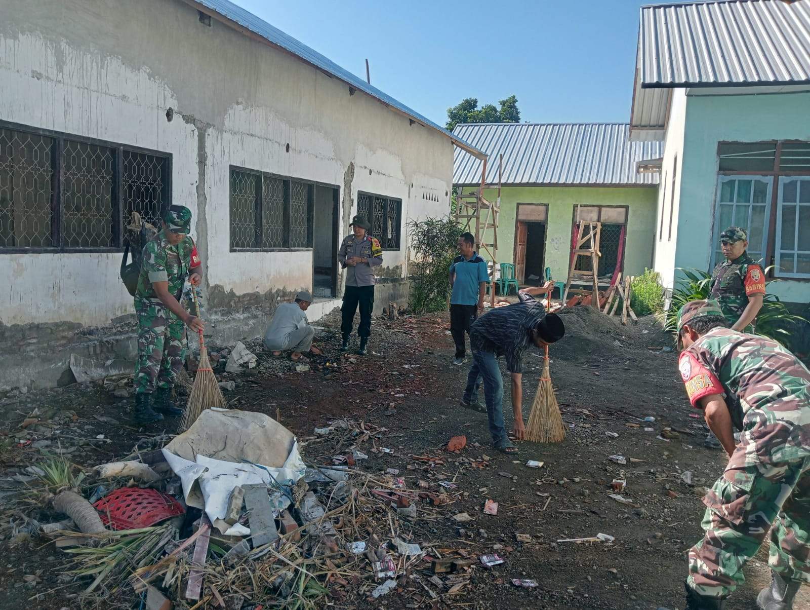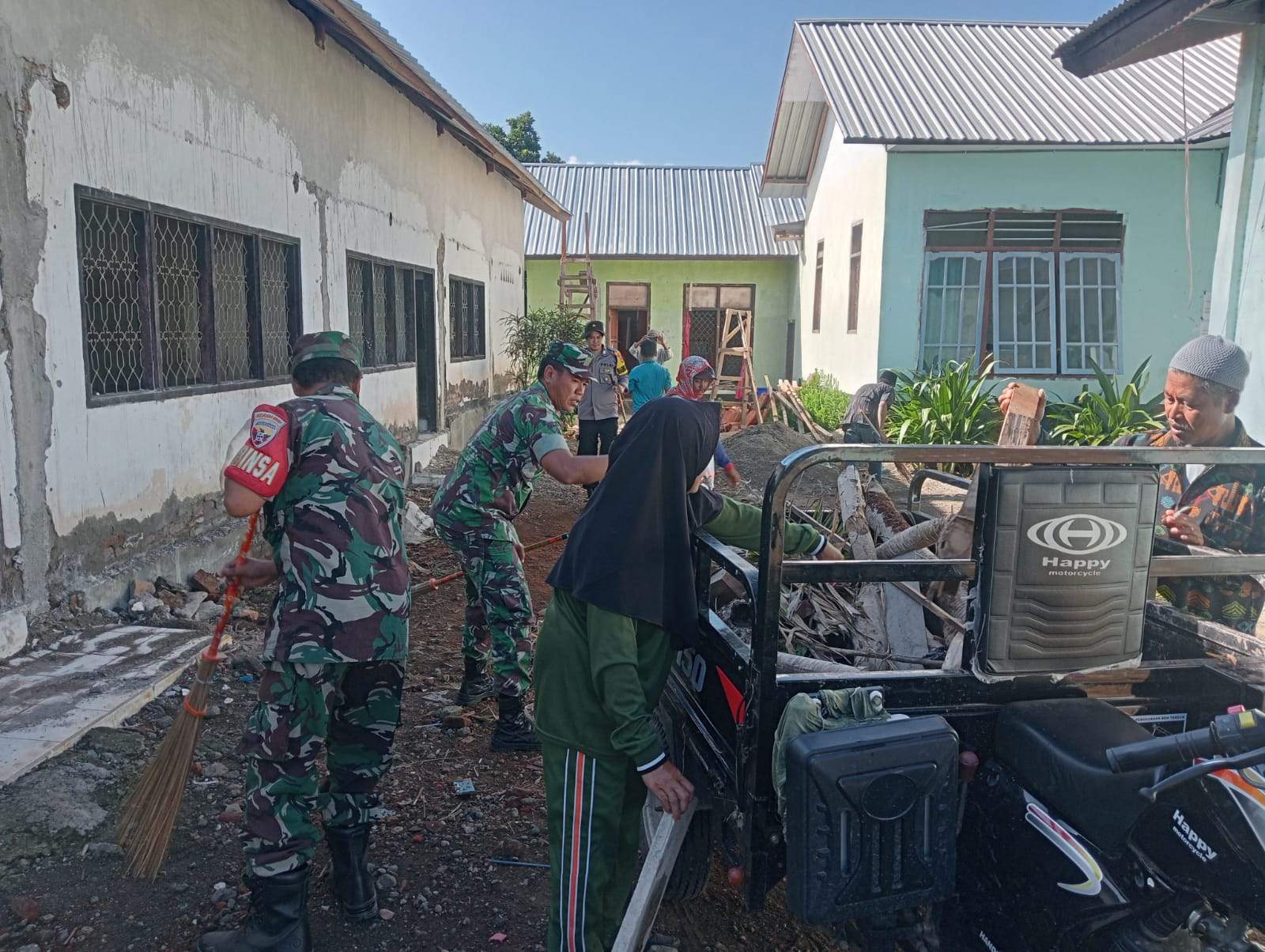 XposeTV Lunyuk – Sumbawa|NTB, Dalam rangka meningkatkan kebersihan lingkungan serta mendukung kegiatan kemasyarakatan, Koramil 1607-07/Lunyuk turut serta dalam karya bakti pembersihan kantor Desa Padasuka bersama masyarakat Dusun Ruku, Kecamatan Lunyuk.