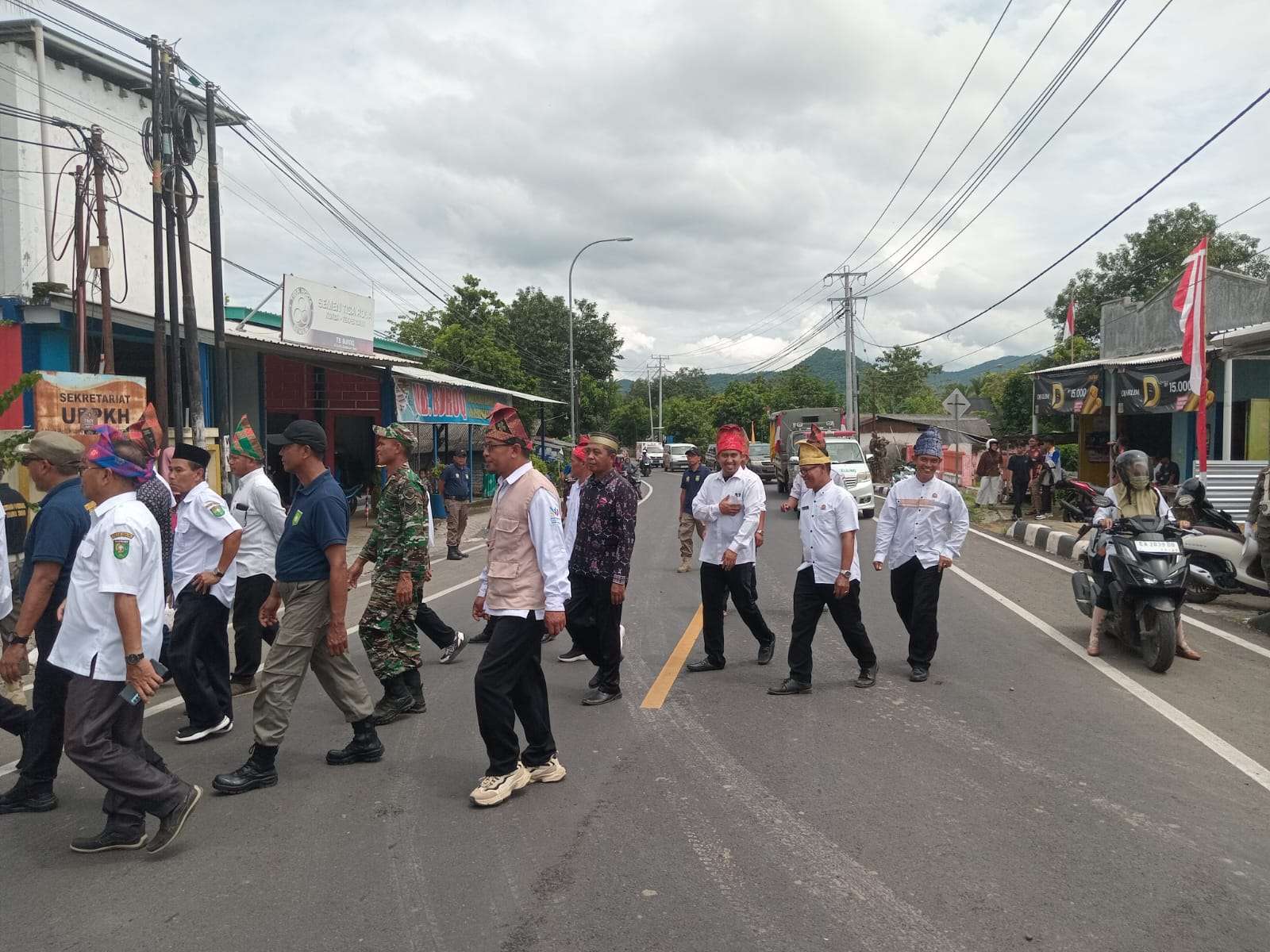 Pasukan pembawa Bendera Pataka Kabupaten Sumbawa melanjutkan perjalanan dari Kantor Camat Lape menuju Kantor Camat Lopok untuk melanjutkan rangkaian kirab di wilayah berikutnya.