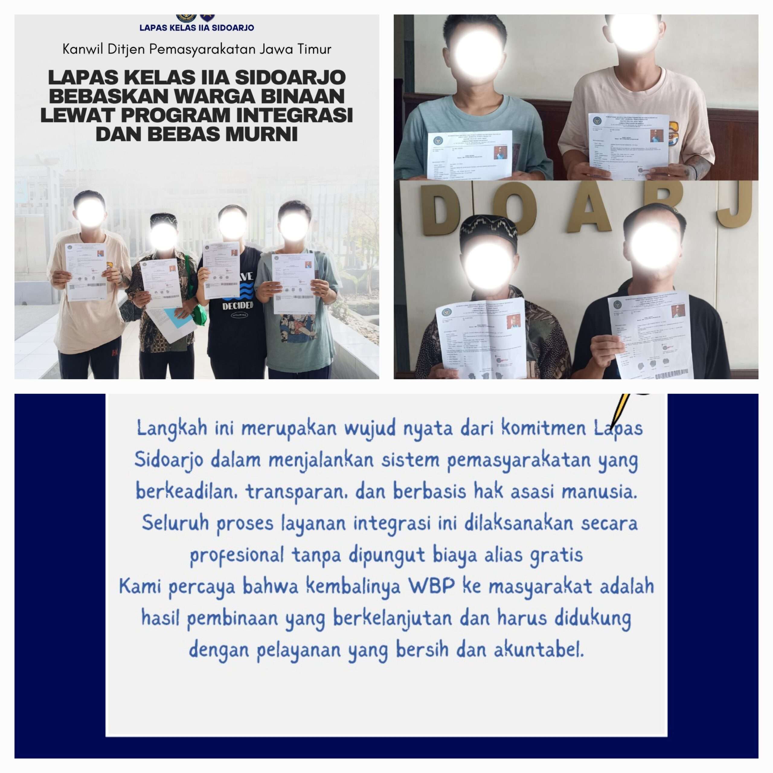 Kepala Lapas Kelas IIA Sidoarjo, Disri Wulan Agus Tomo, menyampaikan bahwa proses pembebasan dilakukan secara transparan, akuntabel, dan tanpa dipungut biaya sepeser pun.