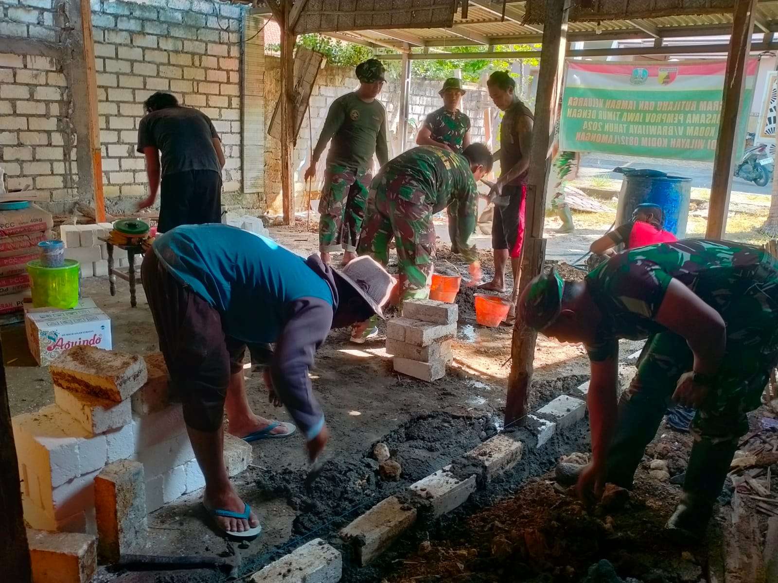 Setelah beberapa hari yang lalu dilaksanakan pembongkaran terhadap rumah warga yang memang tidak layak huni, sekarang dilanjutkan proses pembangunan.Terlihat anggota Babinsa Kodim 0812/Lamongan dibantu Warga sekitar saling bahu membahu demi mewujudkan hunian yang layak.