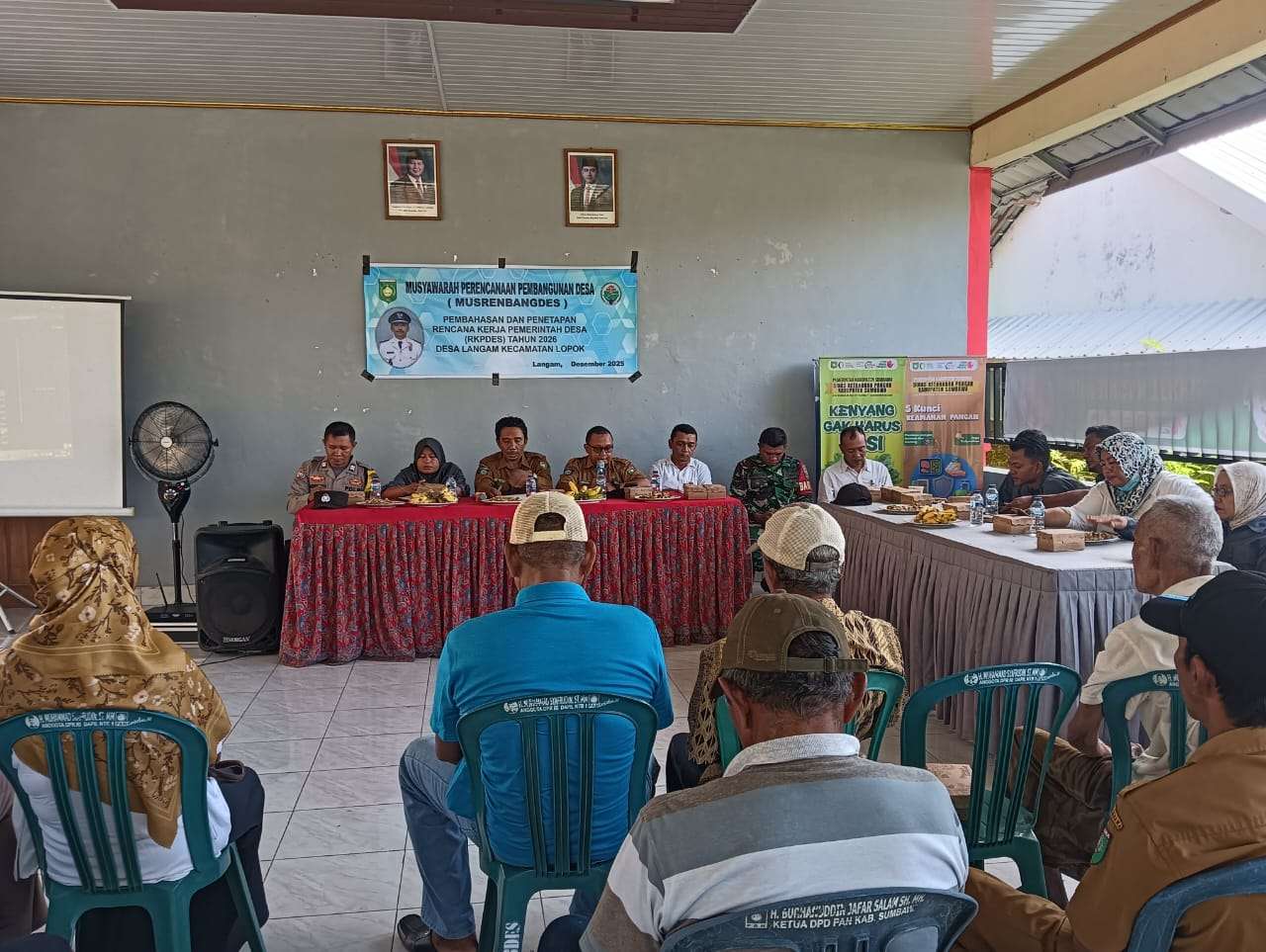 “Musrenbangdes ini menjadi momentum penting untuk menyusun rencana pembangunan yang benar-benar dibutuhkan masyarakat. TNI siap mendukung demi terwujudnya kesejahteraan warga Desa Langam,” ujar Babinsa.
