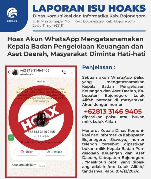 Kepala Dinas Komunikasi dan Informatika Kabupaten Bojonegoro Siswoyo memastikan nomor WhatsApp tersebut bukanlah milik Kepala BPKAD Kabupaten Bojonegoro Luluk Alifah. Terlebih akun WhatsApp tersebut terdaftar sebagai akun bisnis yang bergabung pada bulan lalu.