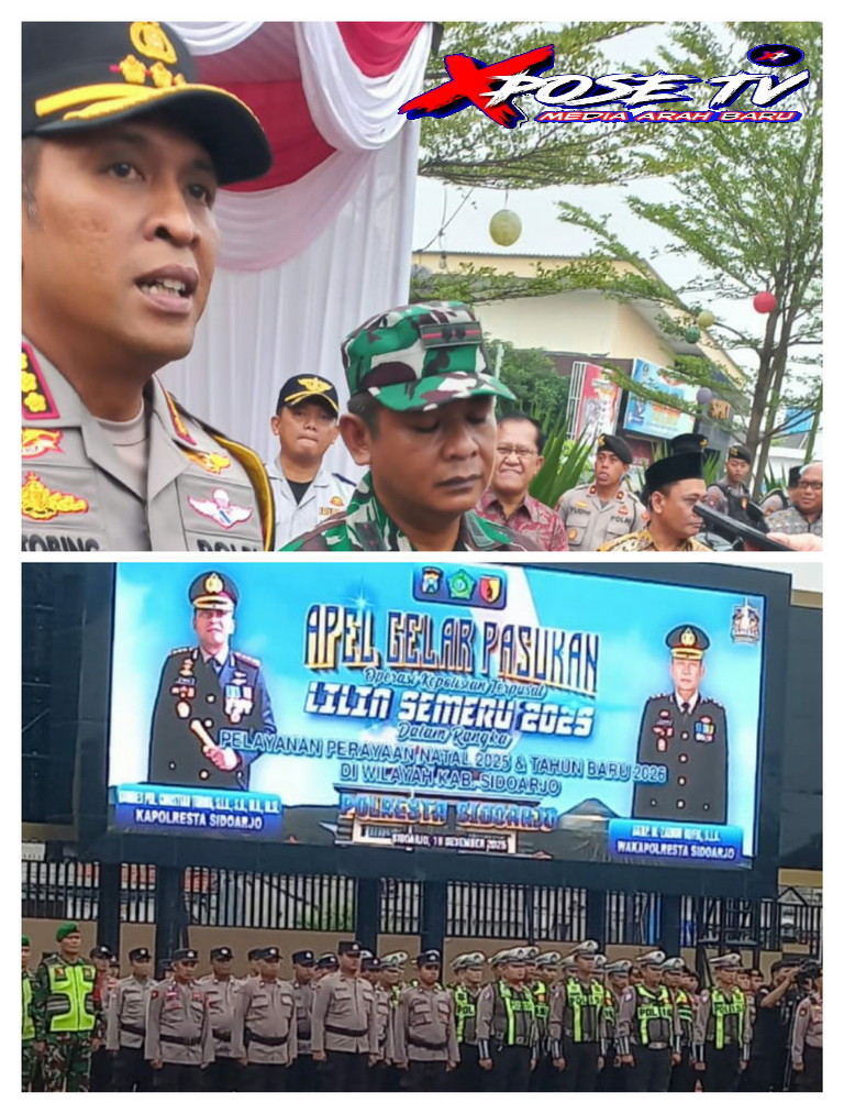 Xpose tv.Live, Sidoarjo – Pengamanan Natal 2025 dan perayaan Tahun Baru 2026 (Nataru), untuk mewujudkan kamseltibcarlantas serta kenyamanan masyarakat Kabupaten Sidoarjo dinyatakan siap dilaksanakan. Melalui Apel Gelar Pasukan Operasi Lilin Semeru 2025 yang berlangsung di Lapangan Apel Mako Polresta Sidoarjo, Jum’at (19/12/25).