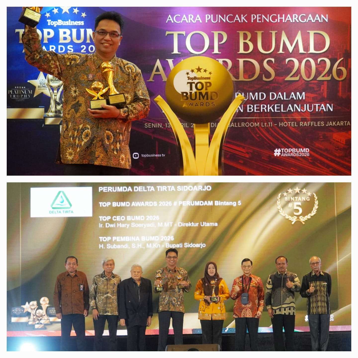 Penghargaan tersebut diterima langsung oleh Direktur Utama Perumda Delta Tirta Sidoarjo, Ir. Dwi Hary Soeryadi, M.M.T., di Jakarta. Senin (13/4/26). Penghargaan yang didapat adalah sebagai TOP perusahaan BUMD 2026, sebagai TOP Direktur Utama BUMD 2026, dan untuk Bupati Sidoarjo H. Subandi, S. H., M. Kn sebagai TOP Pembina BUMD 2026.