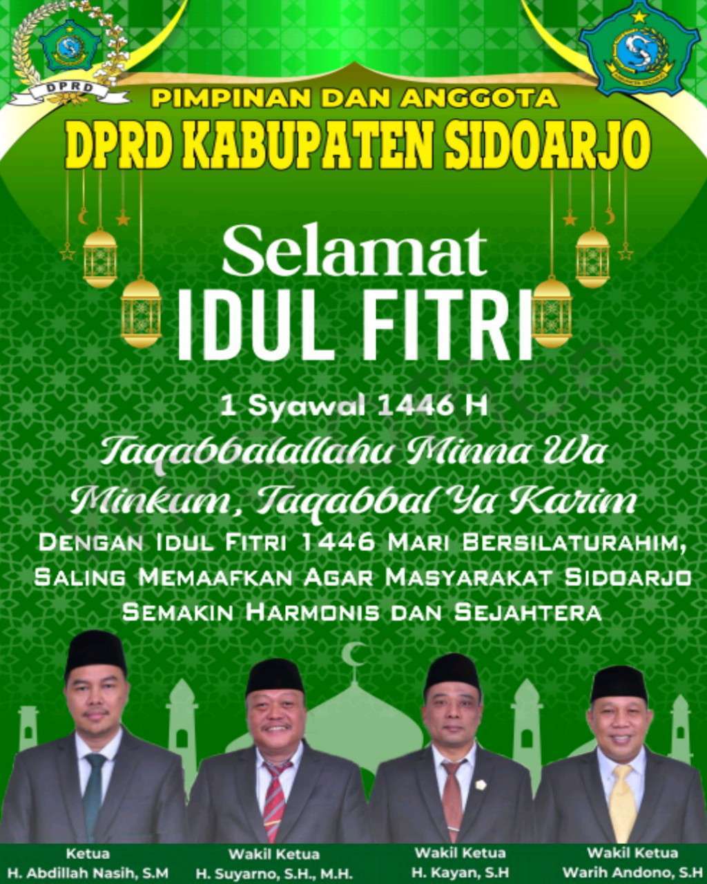 ” Taqobballohu minna waningkum taqobbal ya karim”, Dengan ini kami segenap Pimpinan dan Anggota DPRD Sidoarjo Mengucapkan Selamat Merayakan Hari Raya Idhul Futri 1446H, mari saling bersilaturahim saling memaafkan agar masyarakat Sidoarjo semakin harmonis dan srjahtera amiiin.