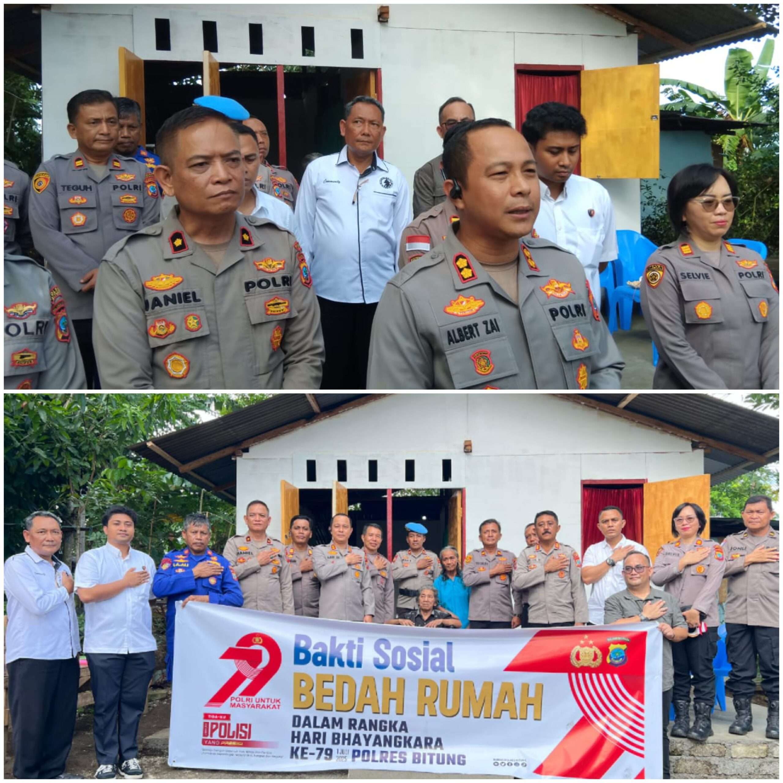 Kapolres Bitung, AKBP Albert Zai, SIK, MH, secara simbolis melakukan gunting pita sebagai tanda peresmian rumah yang telah direnovasi. Turut hadir dalam acara tersebut Ibu Ketua Cabang Bhayangkari, Wakapolres Bitung, para pejabat utama Polres Bitung, Kapolsek Maesa, serta warga setempat.