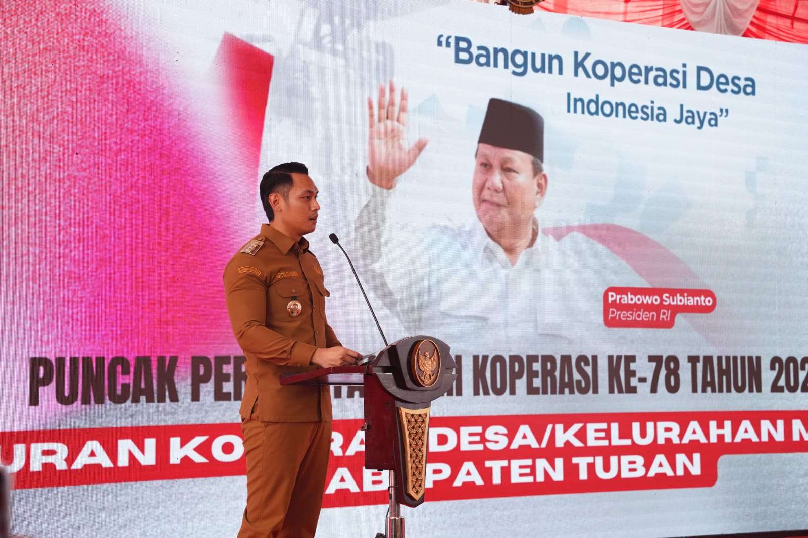Bupati Tuban, Aditya Halindra Faridzky, menyampaikan terima kasih atas perhatian Presiden dan Gubernur terhadap penguatan ekonomi desa. Ia menjelaskan bahwa sebanyak 328 KDMP di desa dan kelurahan di Kabupaten Tuban telah terlembaga dan terhubung dengan berbagai mitra strategis, termasuk BUMN dan BUMD.