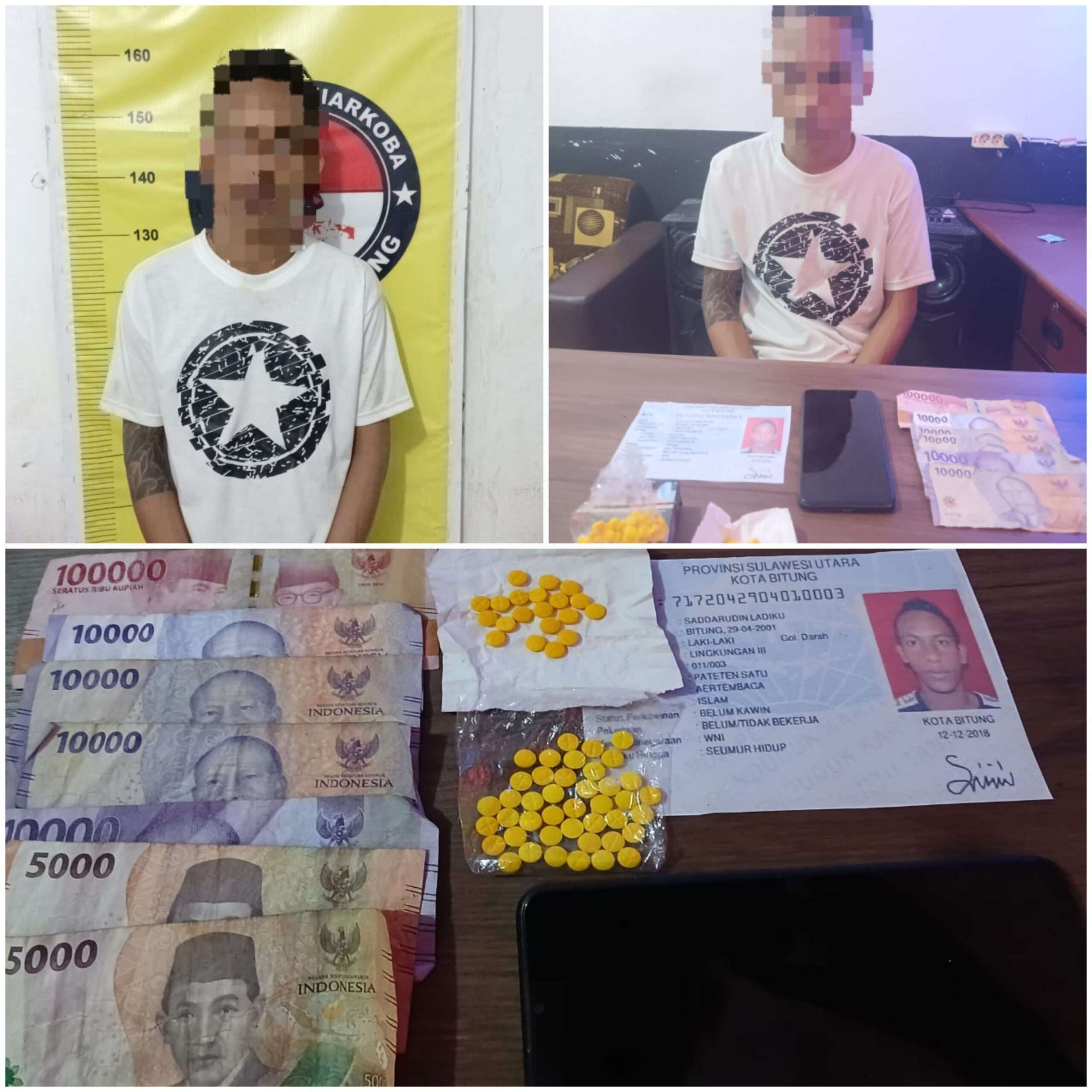 Setelah pemeriksaan, ditemukan 20 butir Trihexyphenidyl dalam kepemilikan Dilla. Dari pengembangan kasus, tim berhasil menangkap Dimas di Kelurahan Girian Bawah pada pukul 23.00 WITA. Pelaku mengaku telah menjual obat tersebut seharga Rp10.000 per butir dan masih menyimpan 42 butir lagi di rumahnya.