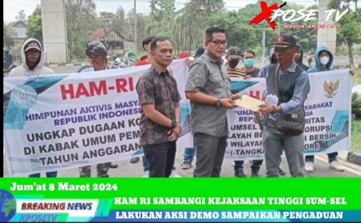 Palembang Xposetv//Himpunan Aktivis Masyarakat – Republik Indonesia atau HAM-RI menyambangi kantor Kejaksaan Tinggi Sumatera Selatan untuk melakukan aksi demo menyampaikan aspirasi dan memberikan pengaduan pada, Jumat (08/03/24)