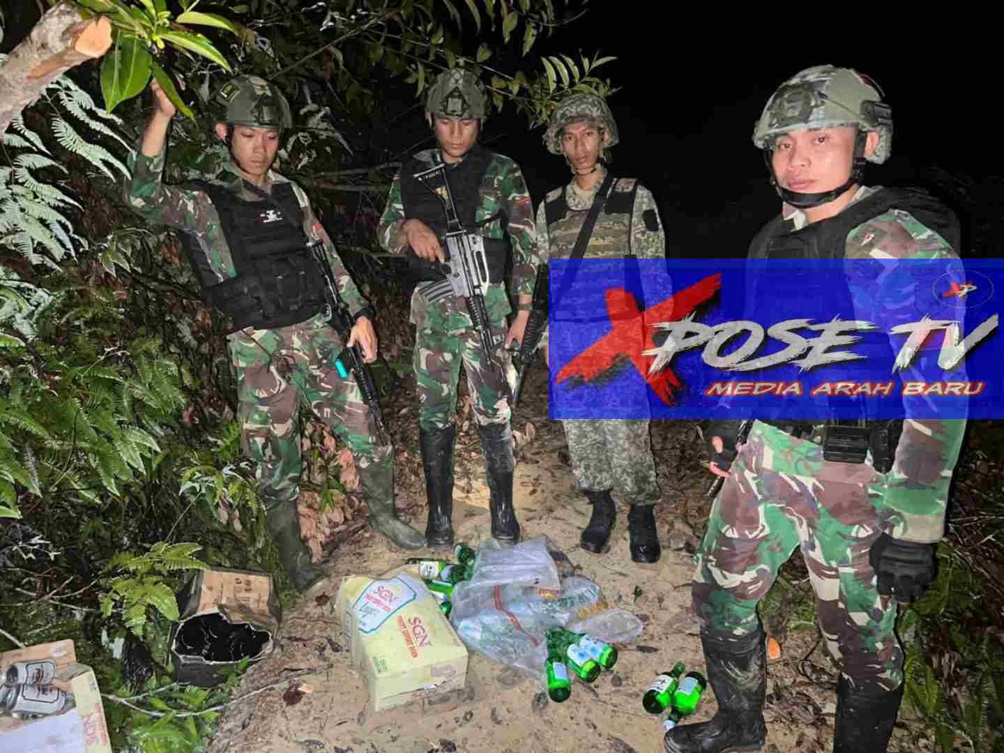 Satuan Tugas Pengamanan Perbatasan (Satgas Pamtas) RI – Malaysia Yonarmed 16/ TK mengamankan Miras Asal Malaysia di Jalur tikus, Dusun Aruk, Desa Sebunga, Kabupaten Sambas, Kalimantan Barat