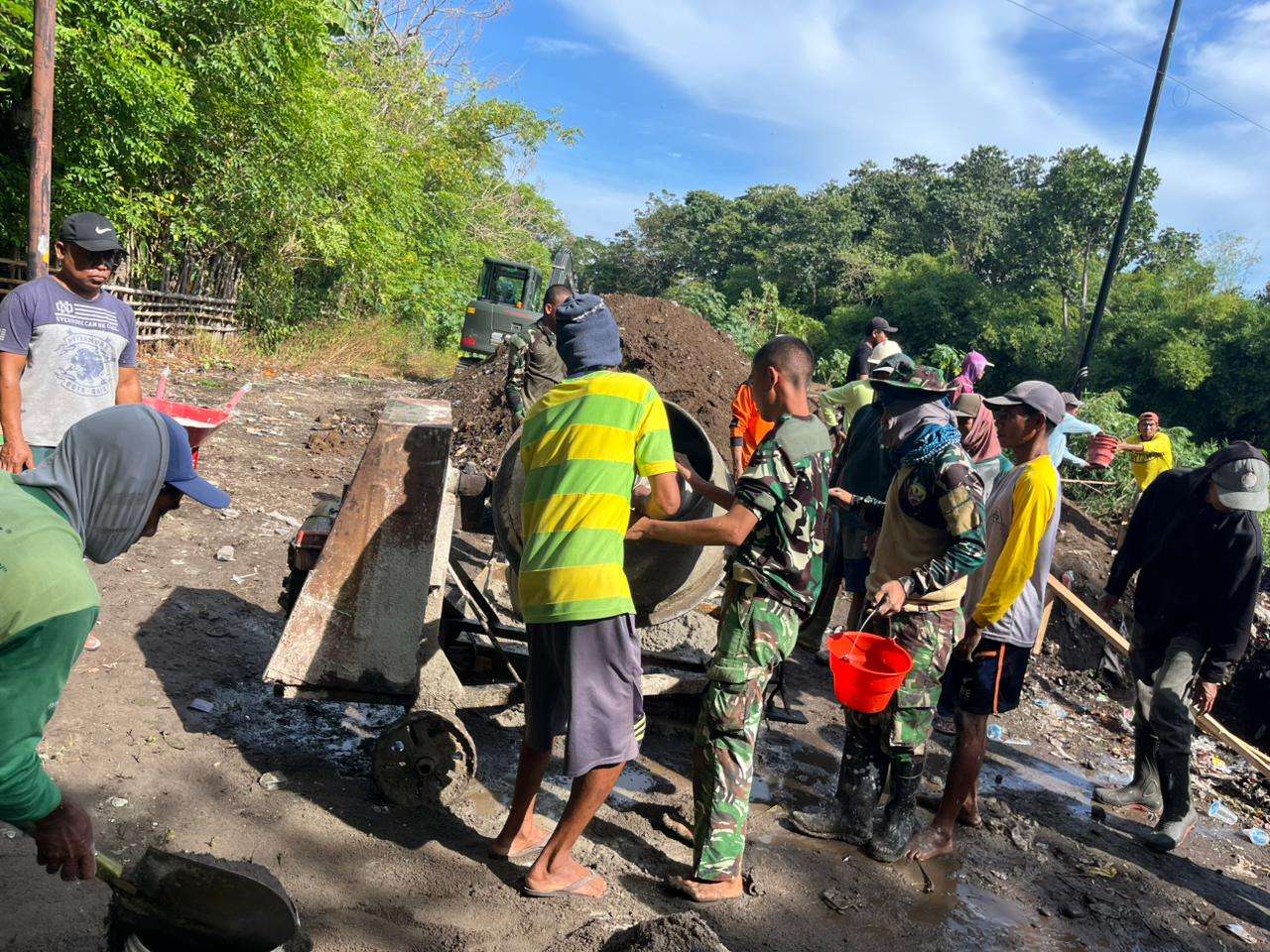 Meski di bawah terik matahari yang cukup menyengat, hal tersebut tidak menjadi penghalang bagi para personel TNI dan masyarakat untuk terus bekerja dengan penuh semangat. Mereka tampak kompak dan saling membantu dalam proses pembangunan pondasi yang menjadi bagian penting dari konstruksi jembatan tersebut.