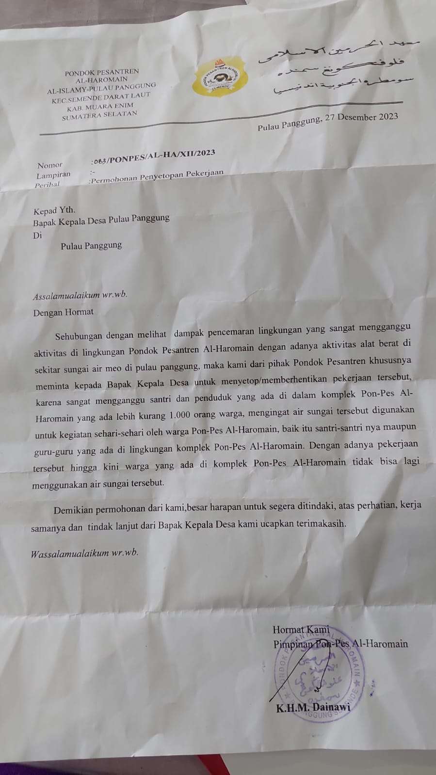 Berdasarkan surat Pimpinan Pondok Pesantren Al-Haromain Nomor : 083/PONPES/AL-HA/XII/2023 Tanggal 27 Desember 2023 yang ditujukan kepada Kepala Desa Pulau Panggung perihal permohonan penyetopan pekerjaan/aktivitas alat berat berupa excavator di sekitar air meo desa Pulau Panggung Kecamatan Semende Darat Laut.