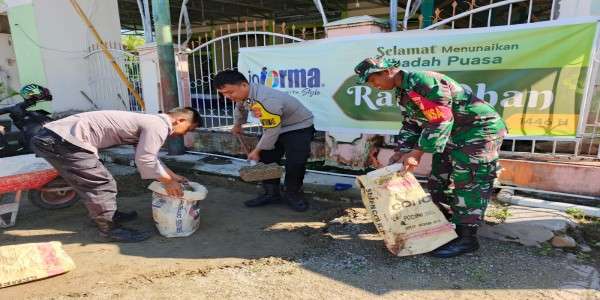 TNI-POLRI bekerja sama dengan masyarakat setempat untuk membersihkan masjid dan lingkungan sekitarnya.