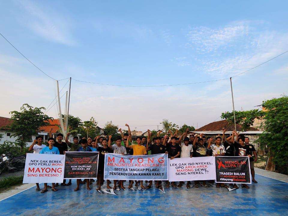 Hari ini Senin, 11 Desember 2023, Puluhan pemuda mayong dan keluarga korban berkumpul di lapangan desa mayong untuk menggelar aksi menuntut keadilan atas pengeroyokan terhadap teman mereka, dengan membawa beberapa banner mereka meneriakkan keadilan dan meminta pihak polisi bekerja secara profesional dengan segera menangkap para pelaku-pelaku pengeroyokan tersebut.