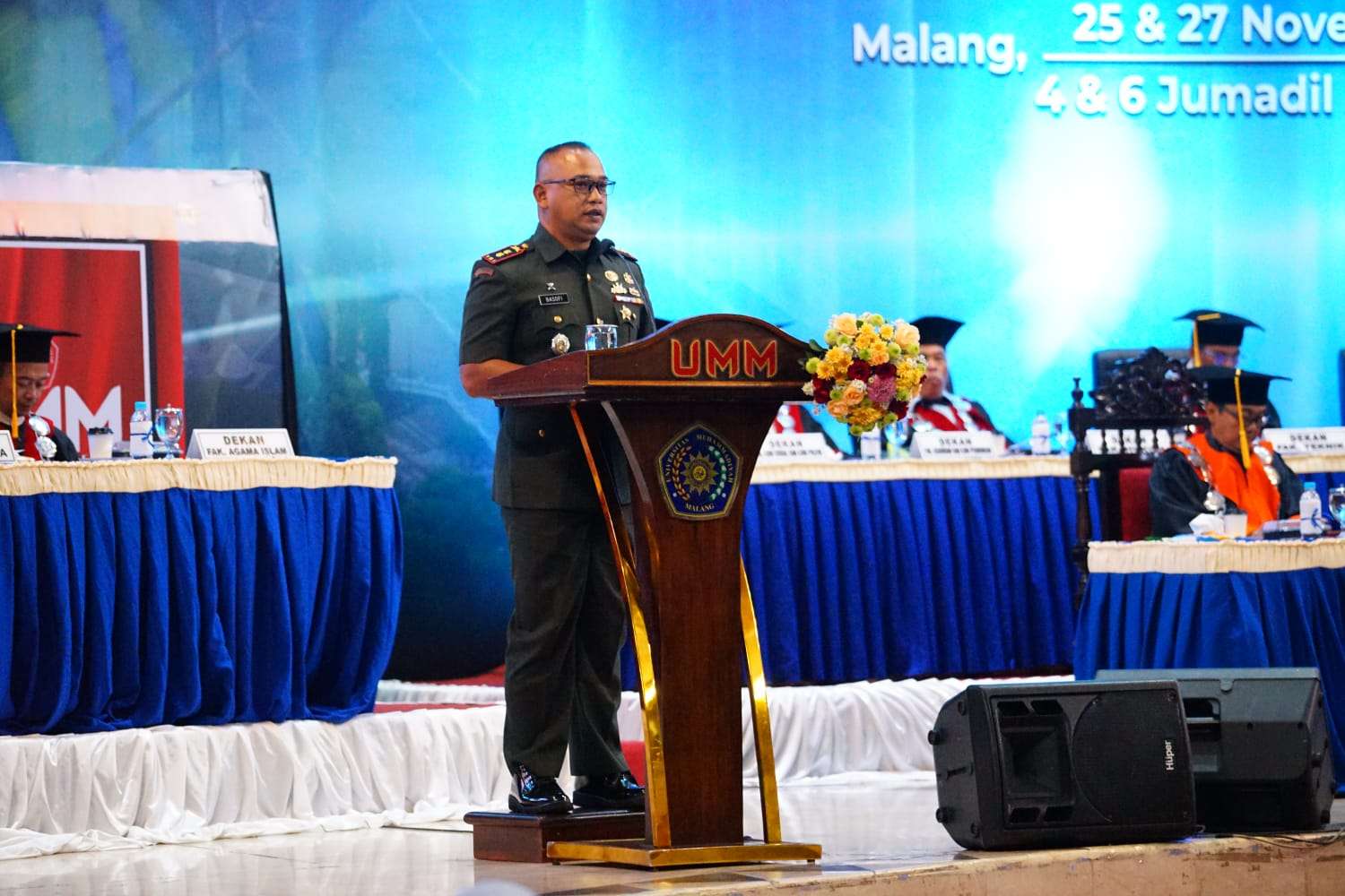Malang – Dandim 1607/Sumbawa, Letkol Kav Basofi Cahyowibowo, S.T., didampingi sang istri, Ny. Fani Basofi Cahyowibowo menghadiri dan memberikan Success Story sebagai salah satu alumni Universitas Muhammadiyah Malang (UMM) pada Sidang Senat Terbuka Wisuda ke-120 Tahun 2025.