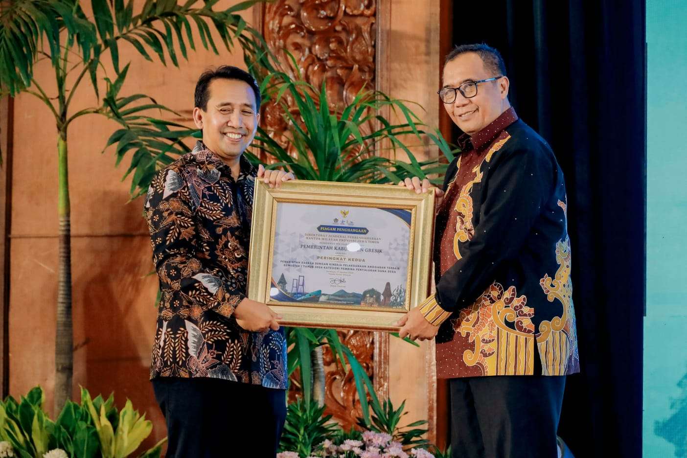 Penghargaan bergengsi ini diberikan oleh (Direktorat Jenderal Perbendaharaan) DJP Kanwil Jawa Timur dan diterima langsung oleh Sekretaris Daerah Kabupaten Gresik Achmad Washil Miftahul Rachman di Surabaya, Selasa (27/08). Tampak hadir bersama Sekda Washil, Kepala Dinas Pemberdayaan Masyarakat dan Desa (PMD) Kabupaten Gresik Abu Hassan.